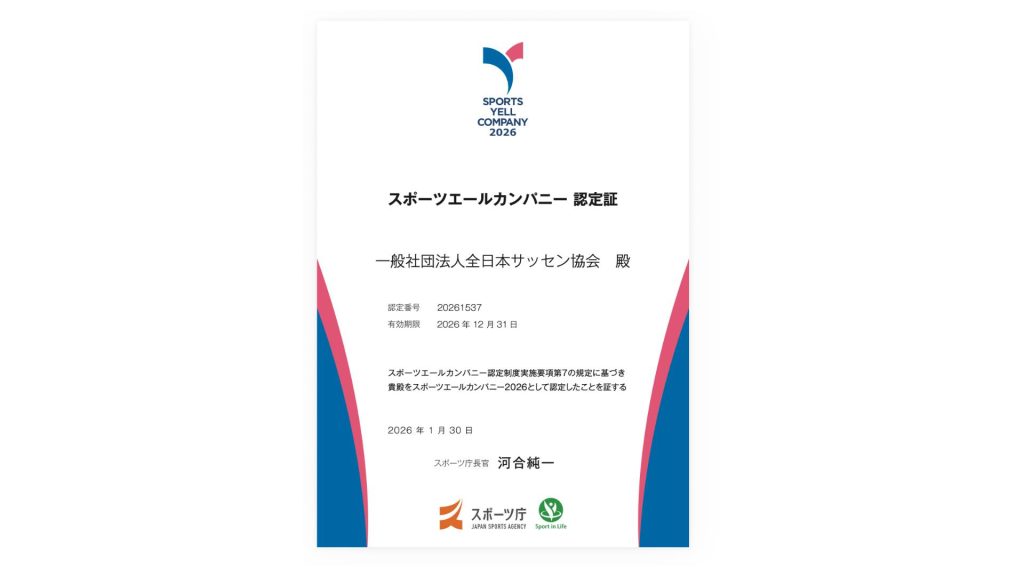 一般社団法人全日本サッセン協会は、スポーツ庁が推進する「スポーツエールカンパニー2026」に認定されました。